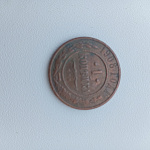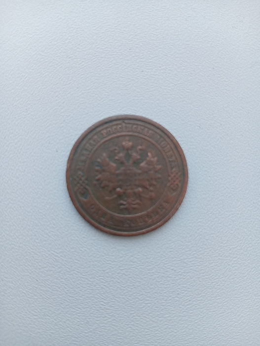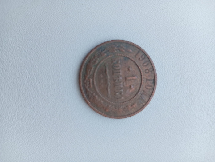 Старинная монета, номиналом в 1 копейку 1908 года.